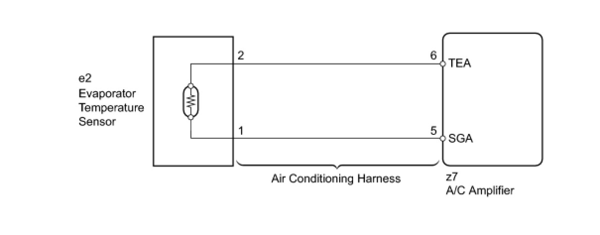 The A/C amplifier applies voltage (5 V) to the evaporator temperature sensor and reads voltage changes as the resistance of the evaporator temperature sensor changes. This sensor is used for frost prevention.