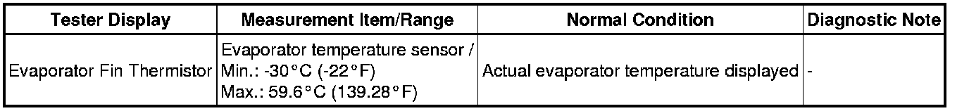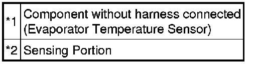 The evaporator temperature sensor is installed on the evaporator in the air conditioning unit to detect the cooled air temperature that has passed through the evaporator and to control the air conditioning. It sends appropriate signals to the A/C amplifier. The resistance of the evaporator temperature sensor changes in accordance with the cooled air temperature that has passed through the evaporator. As the temperature decreases, the resistance increases. As the temperature increases, the resistance decreases.