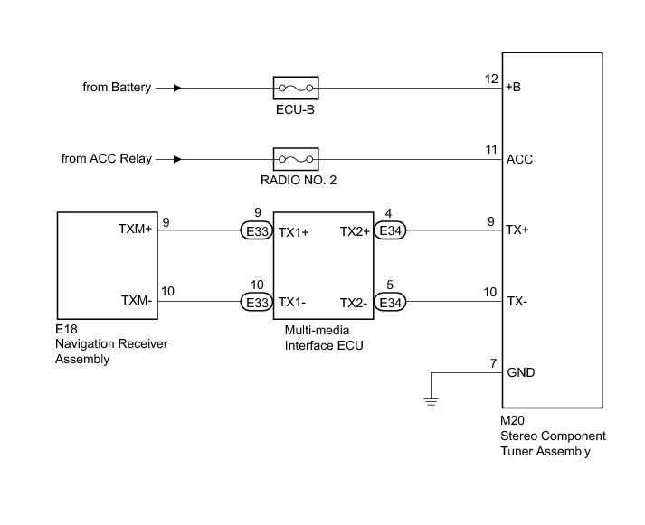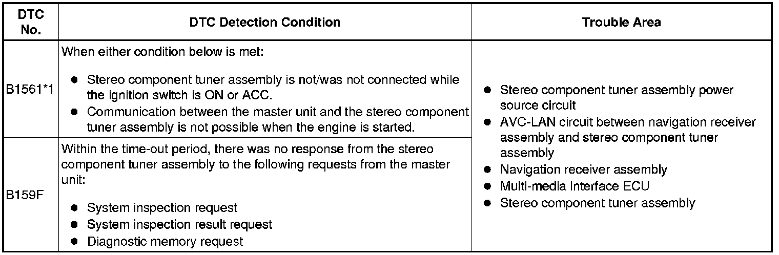 When an AVC-LAN communication error occurs between the navigation receiver assembly and stereo component tuner assembly, these DTCs will be stored.