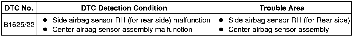 DTC B1625/22 is recorded when a malfunction is detected in the side airbag sensor RH (for rear side).