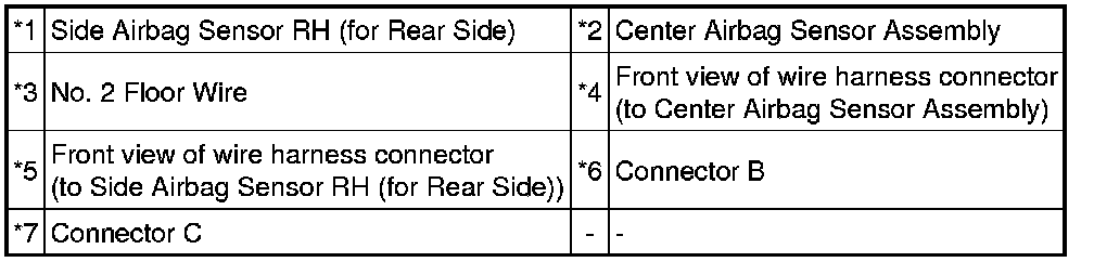 (c) Check that the connectors are properly connected to the center airbag sensor assembly, side airbag sensor RH (for rear side), rear airbag sensor RH and side airbag sensor RH (for front side). Also check that the connectors that link the No. 2 floor wire and front door wire RH are properly connected.