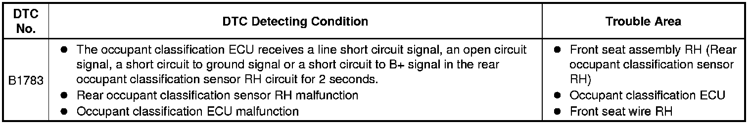DTC B1783 is recorded when a malfunction is detected in the rear occupant classification sensor RH circuit.