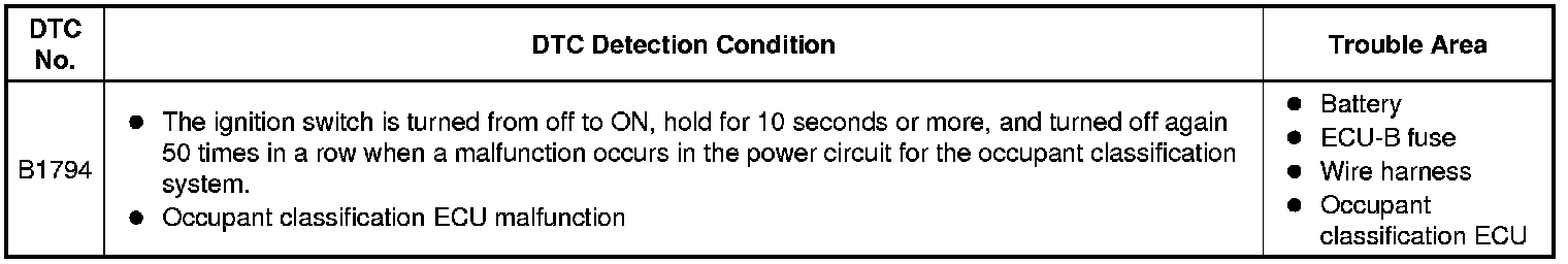 DTC B1794 is recorded when a malfunction is detected in the occupant classification ECU or power source circuit.