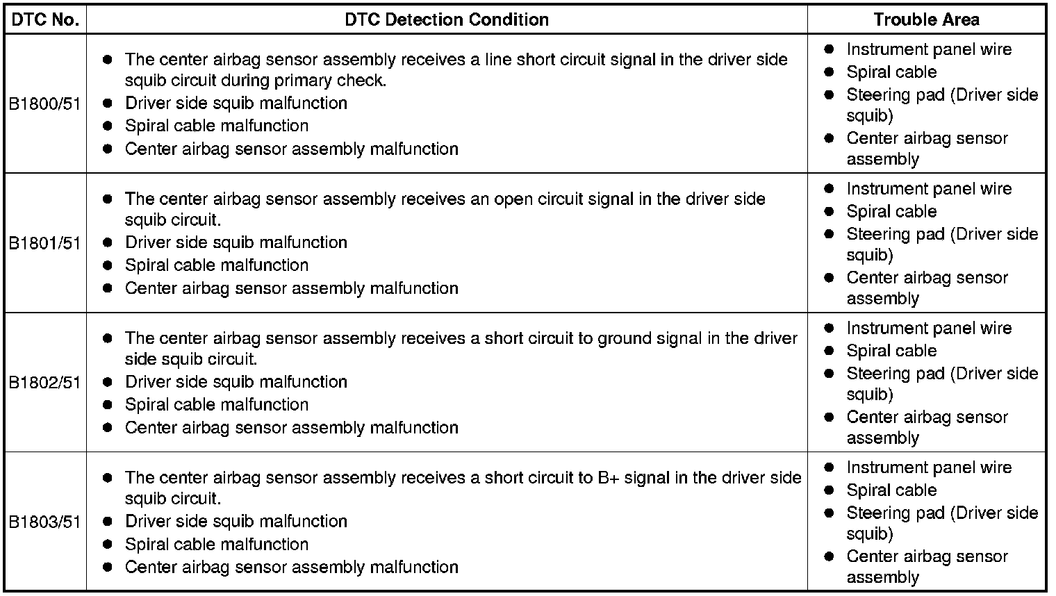 * These DTCs are recorded when a malfunction is detected in the driver side squib circuit.