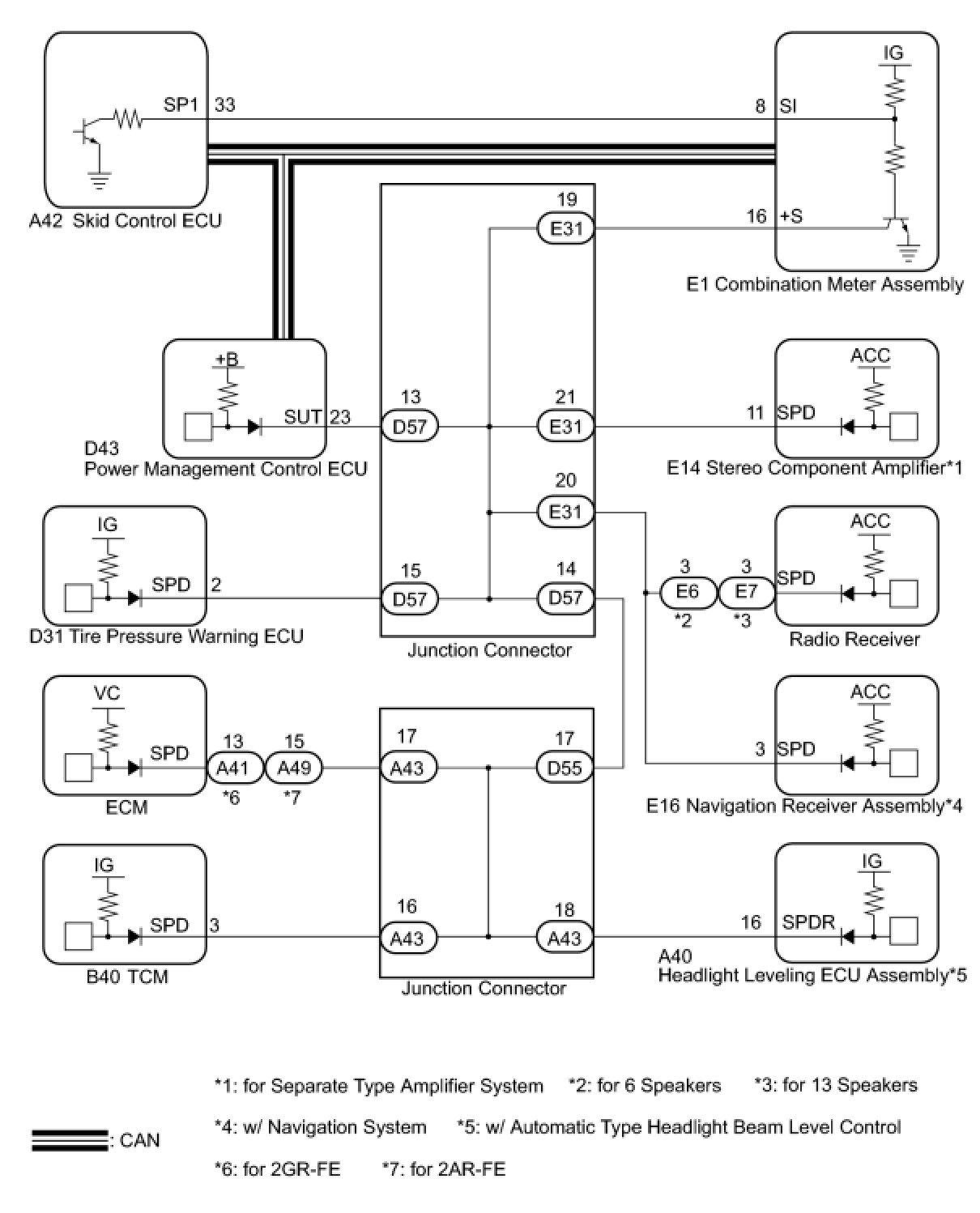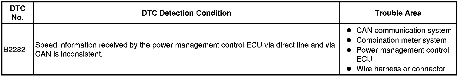 The power management control ECU receives vehicle speed information using 2 methods. It receives a speed signal from the meter ECU. It also receives speed information from the meter ECU via CAN. If the information sent using these 2 methods is inconsistent, this DTC will be stored.