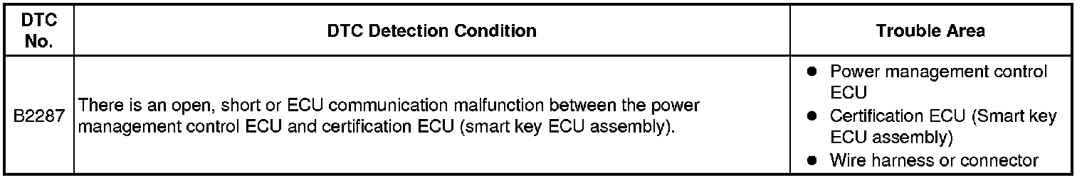 This DTC is stored when there is an open, short or ECU communication malfunction between the power management control ECU and certification ECU (smart key ECU assembly).