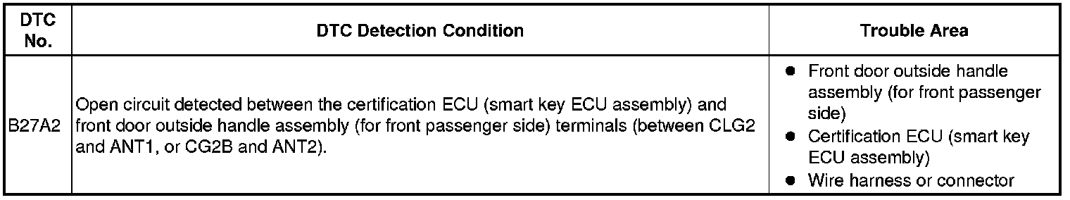 DTC B27A2 is detected by the certification ECU (smart key ECU assembly) if an open circuit is detected between the certification ECU (smart key ECU assembly) and front door outside handle assembly (for front passenger side) terminals (between CLG2 and ANT1, or CG2B and ANT2).