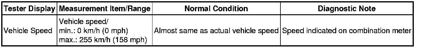 The tire pressure warning ECU receives a vehicle speed signal from the combination meter. This DTC is stored upon entering signal check mode (test mode), and cleared when a vehicle speed signal of 20 km/h (12 mph) is detected for 3 seconds or more. This DTC is output only in signal check mode.