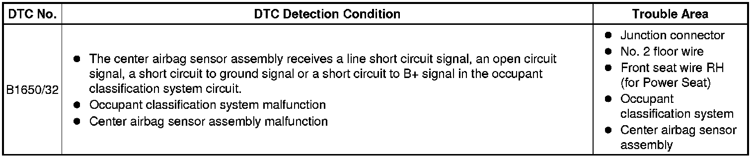 DTC B1650/32 is recorded when a malfunction is detected in the occupant classification system circuit.