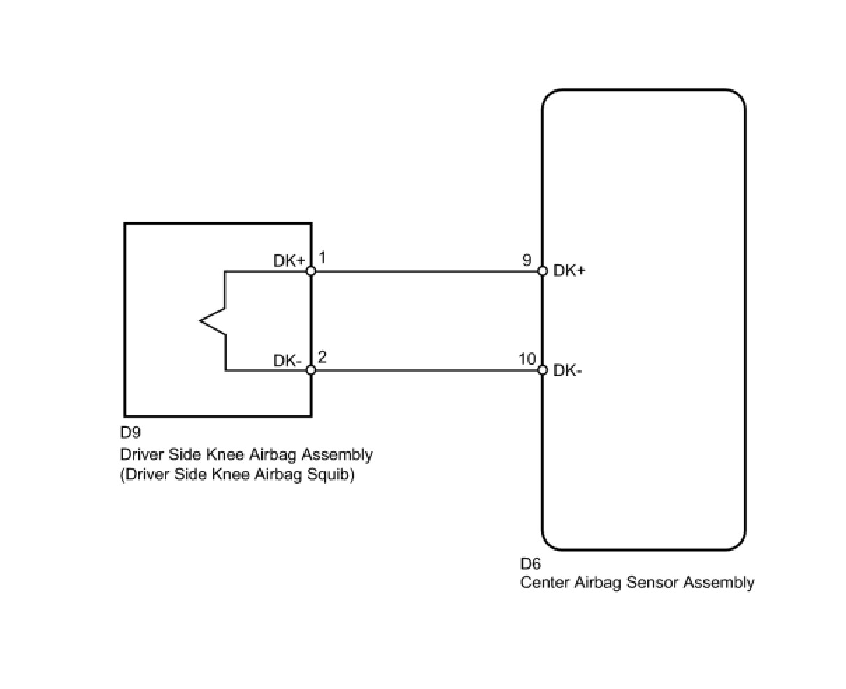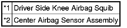 The driver side knee airbag squib circuit consists of the center airbag sensor assembly and driver side knee airbag assembly.