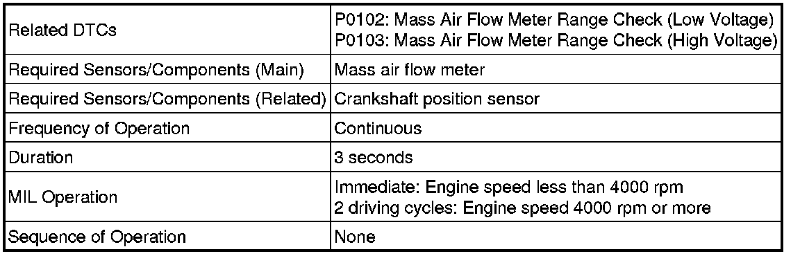 If there is a defect in the mass air flow meter or an open or short circuit, the voltage level deviates from the normal operating range. The ECM interprets this deviation as a malfunction in the mass air flow meter circuit and stores a DTC.
