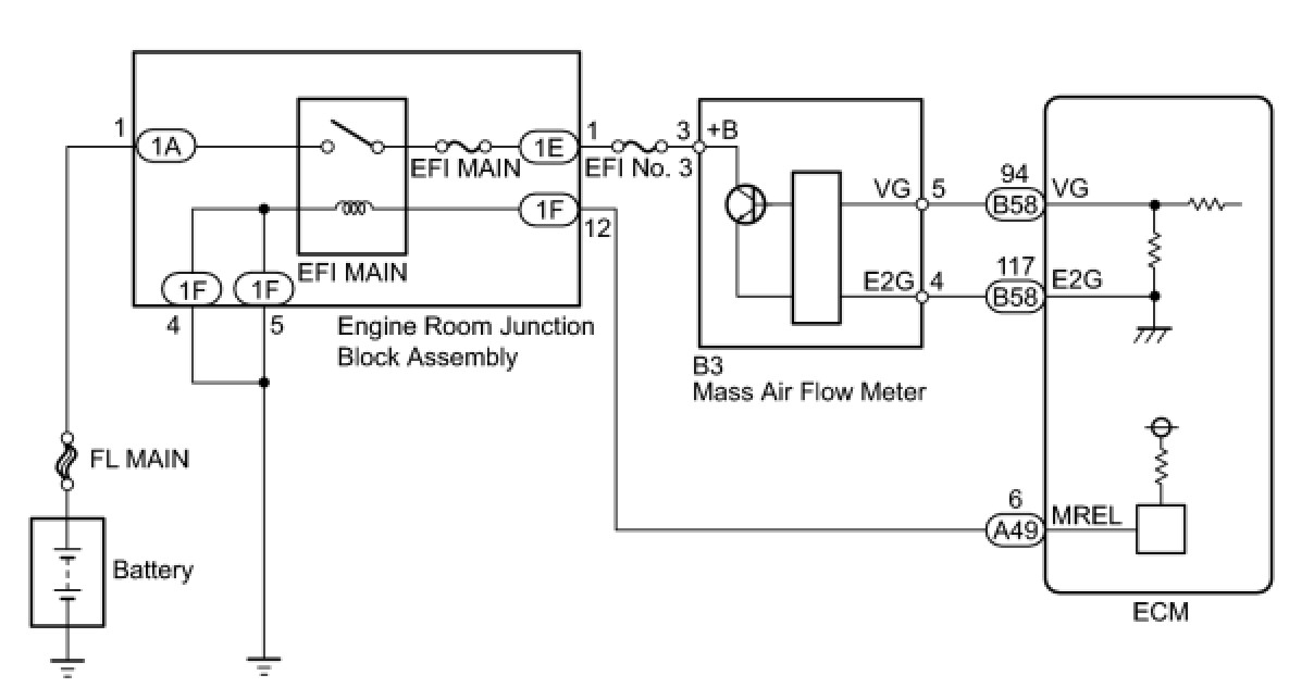 NG -- REPAIR OR REPLACE HARNESS OR CONNECTOR (EFI MAIN RELAY - MASS AIR FLOW METER)
