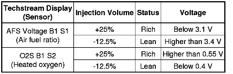 Lean: During Control the Injection Volume for A/F Sensor, the air fuel ratio sensor output voltage (AFS Voltage B1 S1) is consistently higher than 3.4 V, and the heated oxygen sensor output voltage (O2S B1 S2) is consistently below 0.4 V.