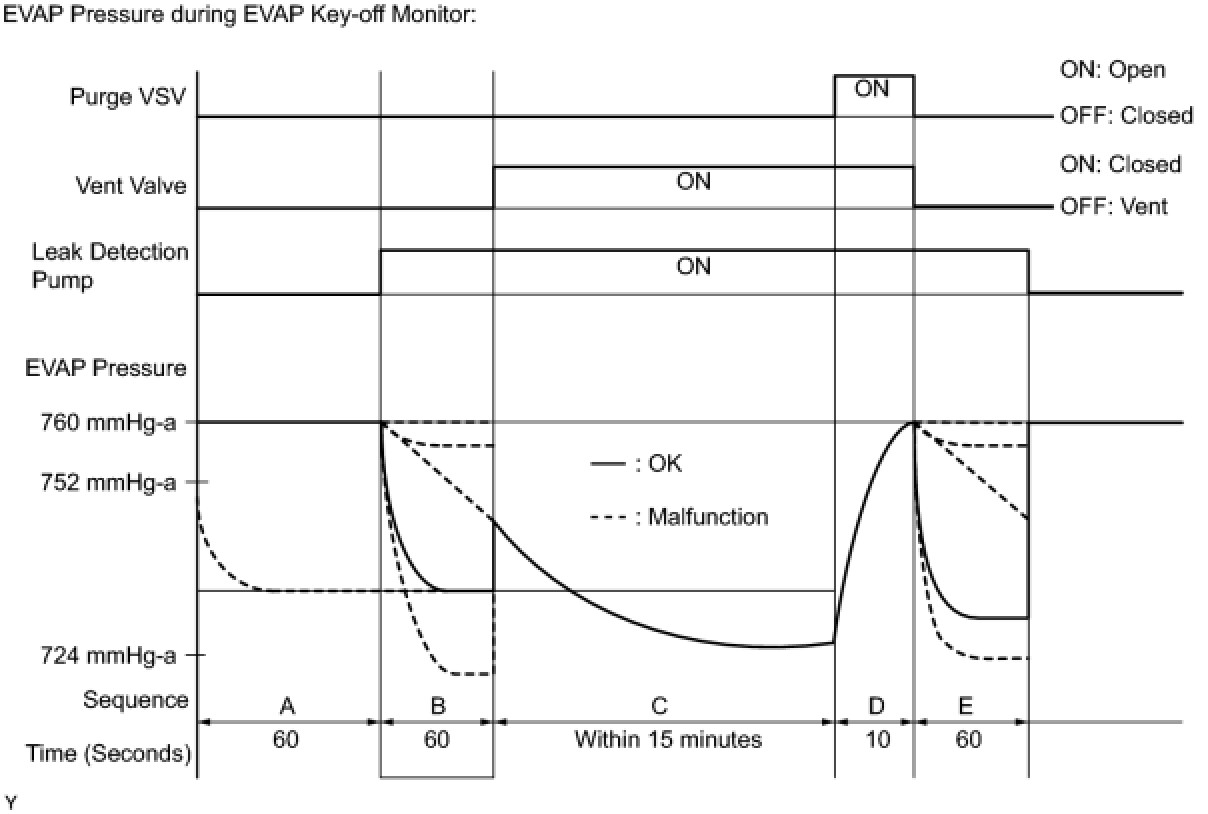 The leak detection pump creates negative pressure through the reference orifice (in operation B and E). When the system is normal, the EVAP pressure is between 97 to 100 kPa-a (724 to 750 mmHg-a)* and saturated within a minute. If not, the ECM interprets this as a malfunction. The ECM illuminates the MIL and stores a DTC if this malfunction is detected in consecutive drive cycles.