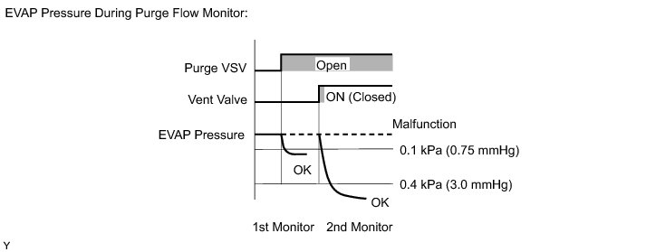 While the engine is running and the purge VSV is ON (open), the ECM monitors the purge flow by measuring the EVAP pressure change. If negative pressure is not created, the ECM begins the 2nd monitor.