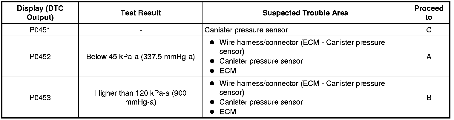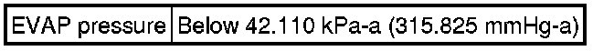 If the canister pressure sensor voltage output [pressure] is below 0.45 V [42.110 kPa-a (315.825 mmHg-a)], the ECM interprets this as an open or short circuit malfunction in the canister pressure sensor or its circuit, and stops the EVAP system monitor. The ECM then illuminates the MIL and stores the DTC (1 trip detection logic).