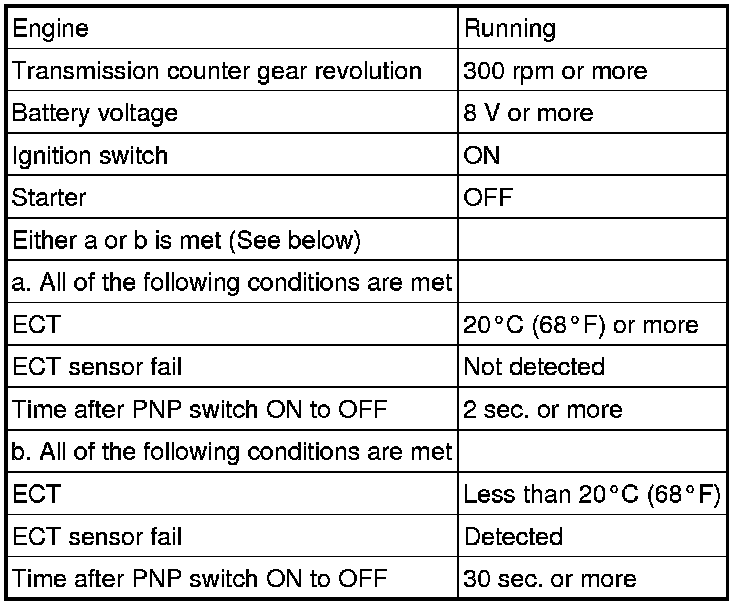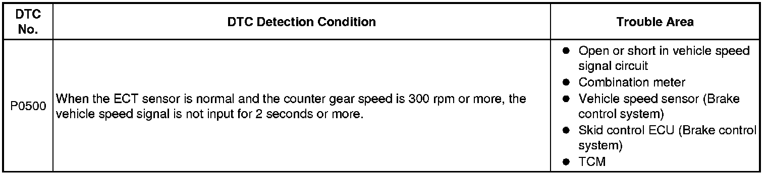 The TCM assumes that the vehicle is being driven when the transmission counter gear indicates more than 300 rpm and over 30 seconds have passed since the park/neutral position switch was turned off. If there is no vehicle speed signal with these conditions satisfied, the TCM concludes that there is a vehicle speed signal malfunction. The TCM will turn on the MIL and a DTC will be set.