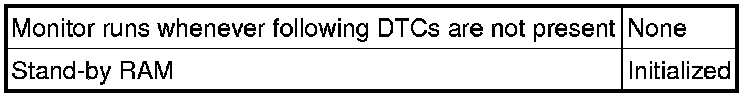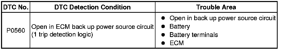 The battery supplies electricity to the ECM even when the ignition switch is off. This power allows the ECM to store data such as DTC history, freeze frame data and fuel trim values. If the battery voltage falls below a minimum level, the stored ECM data is cleared and the ECM determines that there is a malfunction in the power supply circuit. When the engine is next started, the ECM will illuminate the MIL and set the DTC.
