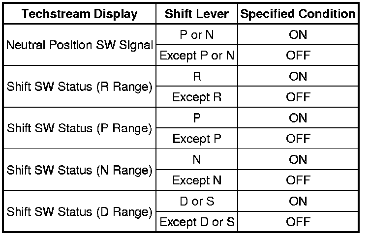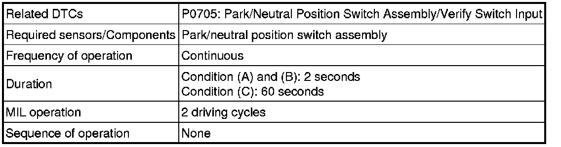 The park/neutral position switch assembly sends a signal to the ECM according to the shift lever position (P, R, N, D, or S). The ECM determines that there is a problem with the switch or related parts if it receives more than 1 position signal simultaneously. The ECM will turn on the MIL and store the DTC.