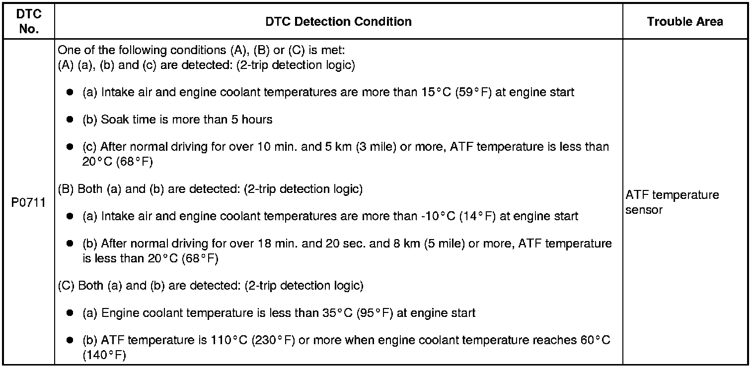 If a circuit related to the ATF temperature sensor becomes open, P0713 is immediately set (in 0.5 seconds). When P0713 is set, P0711 cannot be detected.