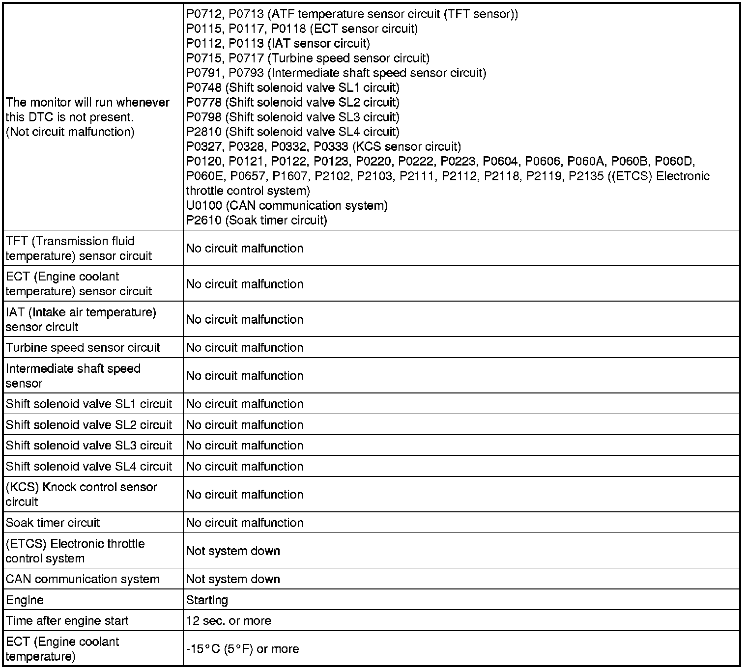 After running the vehicle for a certain period, the ATF temperature should increase. If the ATF temperature is below 20°C (68°F) after running the vehicle for a certain period, the TCM interprets this as a fault, and turns on the MIL.