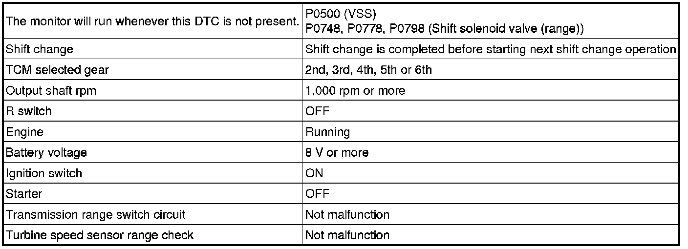 While the vehicle is operating in 2nd, 3rd, 4th or 5th gear with the shift lever in D, if the input shaft revolution (speed) is less than 300 rpm*1 although the output shaft revolution (speed) is more than 1000 rpm*2, the TCM interprets this as a fault, illuminates the MIL and stores the DTC.