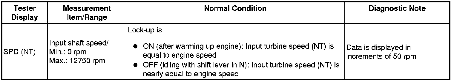 - SPD (NT) is always more than 0 and less than 300 rpm while driving the vehicle at 50 km/h (31 mph) or more: Sensor trouble, improper installation, or intermittent connection trouble of the circuit.