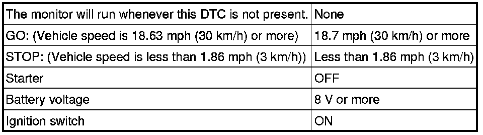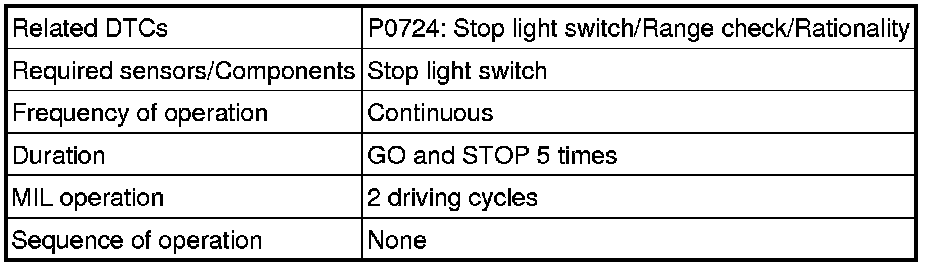 This DTC indicates that the stop light switch remains ON. When the stop light switch remains ON during "stop and go" driving, the TCM interprets this as a fault in the stop light switch, illuminates the MIL, and stores the DTC. The vehicle must stop (less than 3 km/h (2 mph)) and go (30 km/h (19 mph) or more) five times for two consecutive driving cycles in order to set this DTC.
