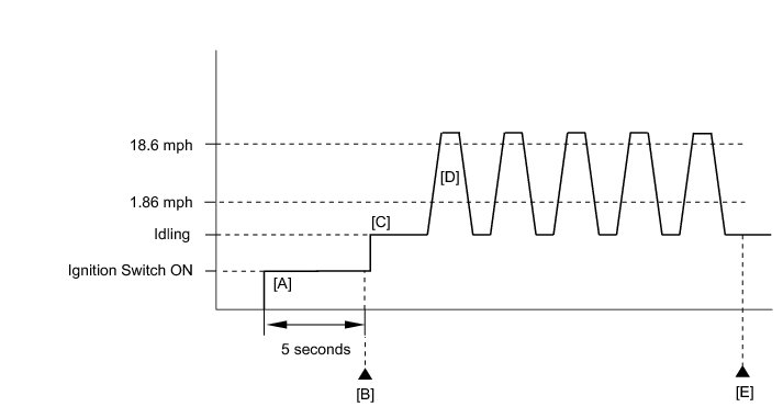 11. Accelerate the vehicle to 18.65 mph (30 km/h) or more, depress the brake pedal and decelerate the vehicle to 1.86 mph (3 km/h) or less [D]. Repeat step [D] 5 times.