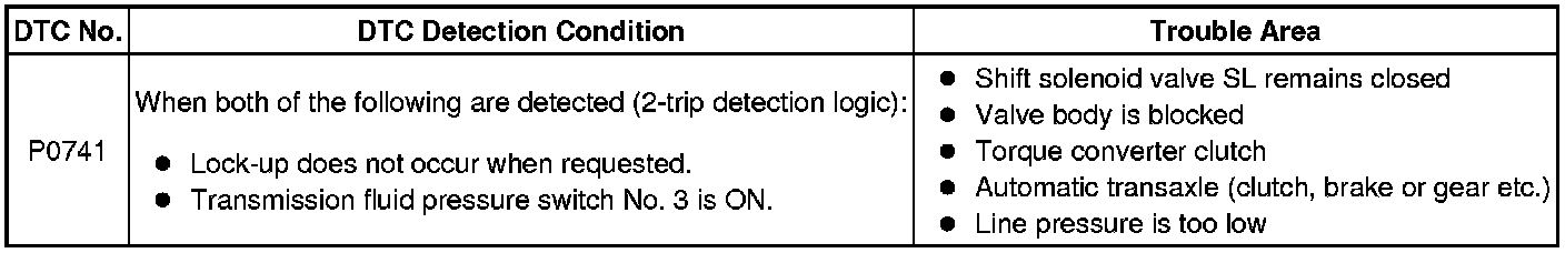 If the TCM detects no lock-up after lock-up has been requested or if it detects lock-up when it is not requested, the TCM interprets this as a fault in shift solenoid valve SL or lock-up system performance. The TCM will turn on the MIL and store the DTC.