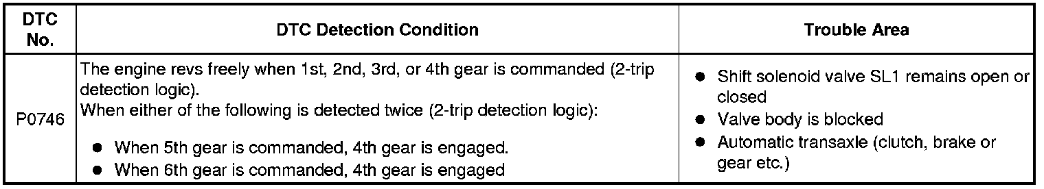 - *2: If shift solenoid SLT is stuck on, the line pressure will be low. Therefore, the amount of torque that can be transmitted by each gear is lower than the normal limit. When the engine power exceeds this lowered limit, the engine speed will increase freely.