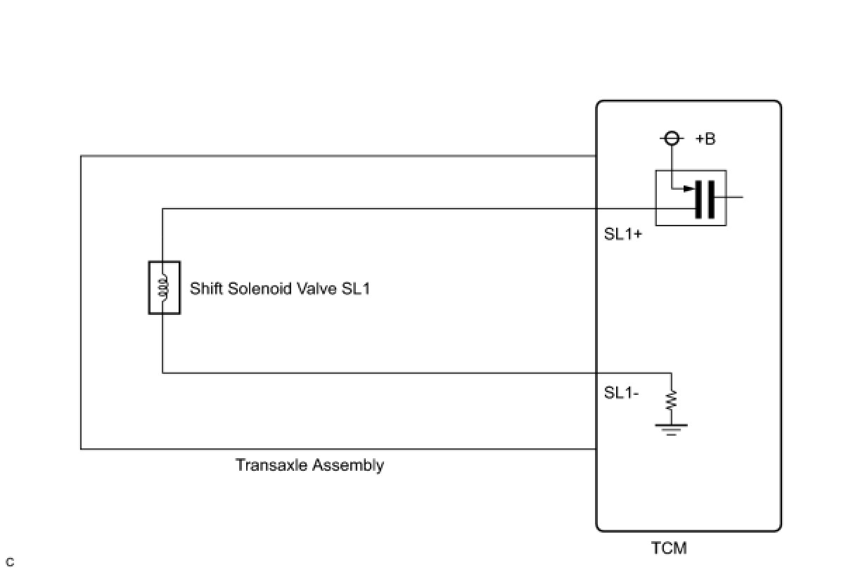 This DTC indicates an open or short in the shift solenoid valve SL1 circuit. The TCM commands gear shifts by turning the shift solenoid valves on or off. When there is an open or short circuit in any shift solenoid valve circuit, the TCM detects the problem and illuminates the MIL and stores the DTC. The TCM also performs the fail-safe function and turns the other normal shift solenoid valves on or off. (In case of an open or short circuit, the TCM stops sending current to the circuit.)