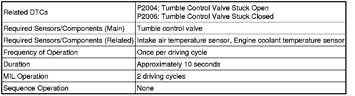 When the ECM has requested a tumble control valve close operation but the actual tumble control valve opening angle is 17 deg or more for 10 seconds, DTC P2004 is output. When the ECM has requested a tumble control valve open operation but the actual tumble control valve opening angle is less than 35 deg for 10 seconds, DTC P2006 is output.