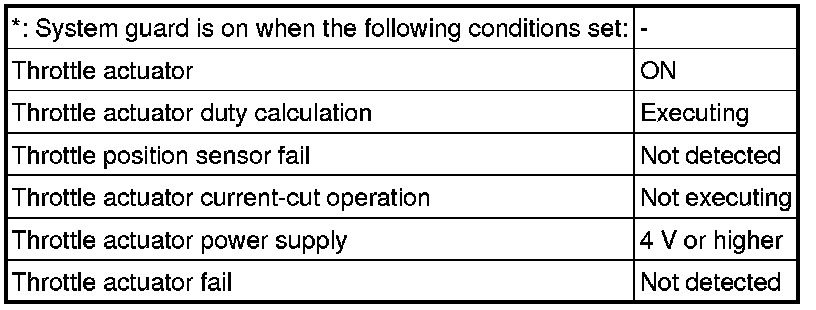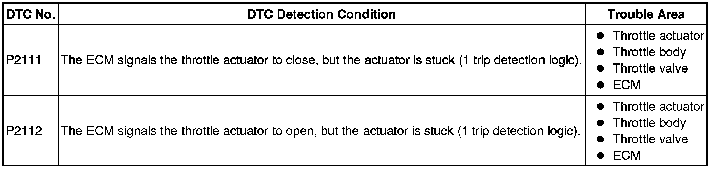 When either of these DTCs, as well as other DTCs relating to Electronic Throttle Control System (ETCS) malfunctions, is stored, the ECM enters fail-safe mode. During fail-safe mode, the ECM cuts the current to the throttle actuator, and the throttle valve is returned to a 6° throttle angle by the return spring. The ECM then adjusts the engine output by controlling the fuel injection (intermittent fuel-cut) and ignition timing, in accordance with the accelerator pedal opening angle, to allow the vehicle to continue running at a minimal speed. If the accelerator pedal is depressed firmly and gently, the vehicle can be driven slowly.