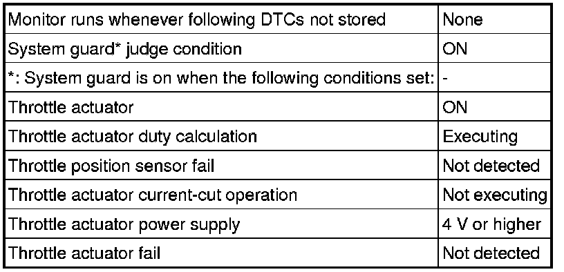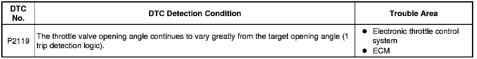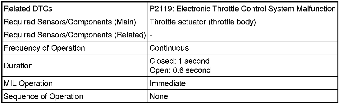 The ECM determines the actual opening angle of the throttle valve from the throttle position sensor signal. The actual opening angle is compared to the target opening angle commanded by the ECM. If the difference between these 2 values is outside the standard range, the ECM interprets this as a malfunction in the electronic throttle control system. The ECM then illuminates the MIL and stores the DTC.