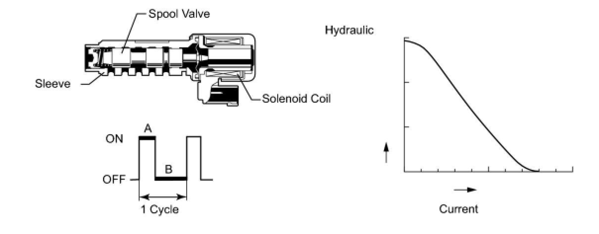 The duty ratio is the ratio of the electrical current on time (A) to the total of the electrical current on and off time (A + B).