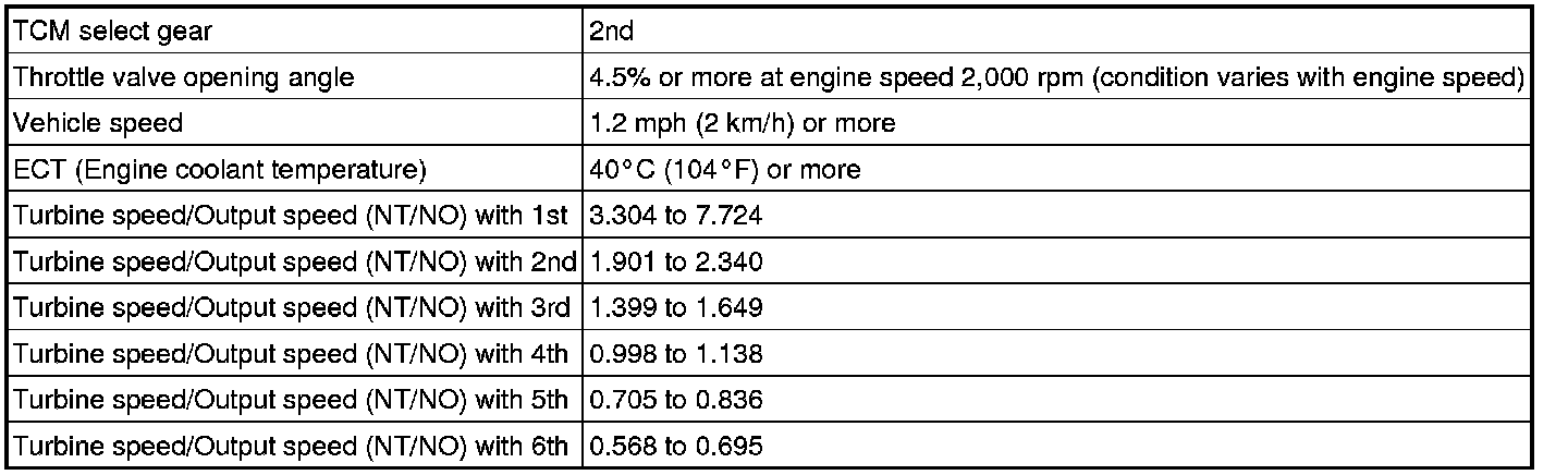 Because the torque converter clutch has not engaged, it may be difficult to obtain the speeds specified in 4th, 5th, and 6th gear, however a difference of speed should still be evident following each gear change.