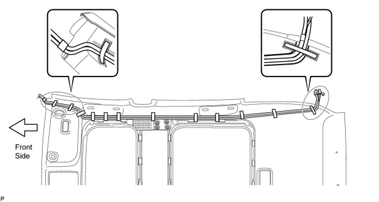 * Secure the antenna cord and washer hose to the roof headlining assembly with tape as shown in the illustration.