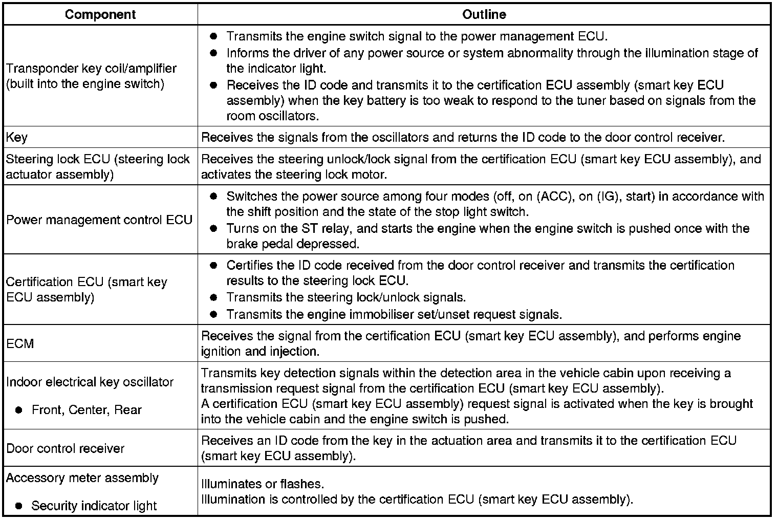 The immobiliser system is a theft deterrent system that determines whether to disable starting of the SFI system based on a comparison of the key ID code and the vehicle pre-registered code. The immobiliser system compares the vehicle certification ECU (smart key ECU assembly) pre-registered ID code with the ID of the key-embedded transponder chip. If the ID codes do not match, the immobiliser system is activated and the SFI system cannot be started. The certification ECU (smart key ECU assembly) manages communication with the ECM, power management control ECU and steering lock ECU (steering lock actuator assembly). When the ID codes of the transponder chip and certification ECU (smart key ECU assembly) match, the certification ECU (smart key ECU assembly) authorizes the SFI system to start.