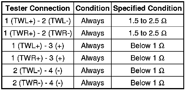 Connect all connectors to the speakers when performing an inspection. If the result is not as specified, replace the speaker assembly.