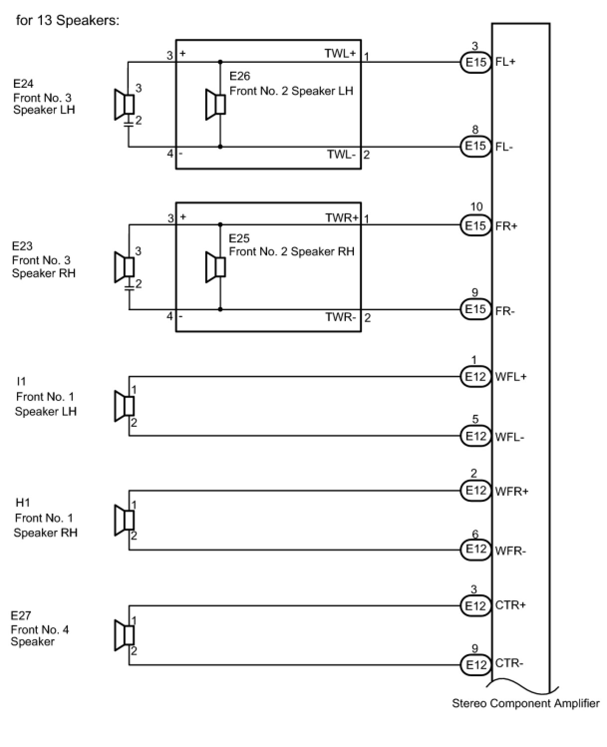 Measure the resistance between each of the front No. 1 speakers and stereo component amplifier to check for an open circuit in the wire harness.