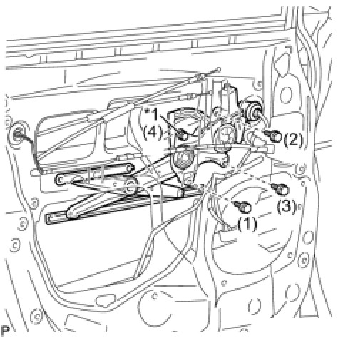 (e) Install the front door window regulator assembly with the 2 bolts.