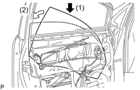 (d) Insert the front door glass sub-assembly into the front door panel along the front door glass run as indicated by the arrows, in the order shown in the illustration.