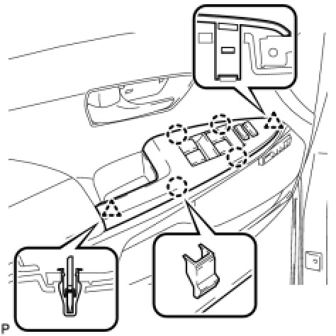 (b) Engage the 2 clips and 4 claws, and install the power window regulator master switch assembly with front door armrest base panel.