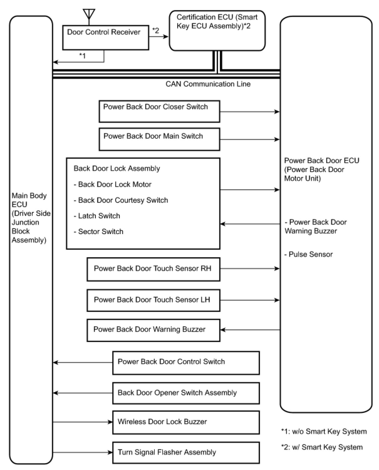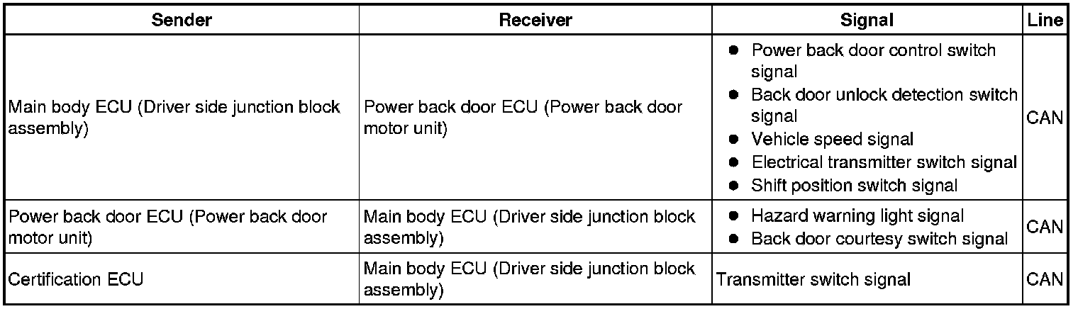 Then, the power back door ECU controls the back door opening/closing operation by sending commands to the back door lock assembly and back door motor unit.