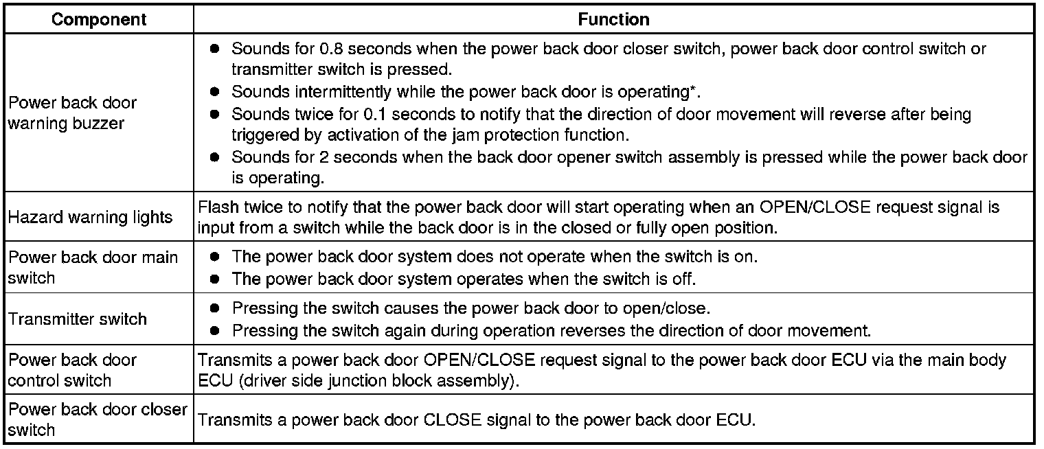 (5) The power back door system sets off an alarm (using a buzzer) and hazard warning lights when the power back door starts operating.