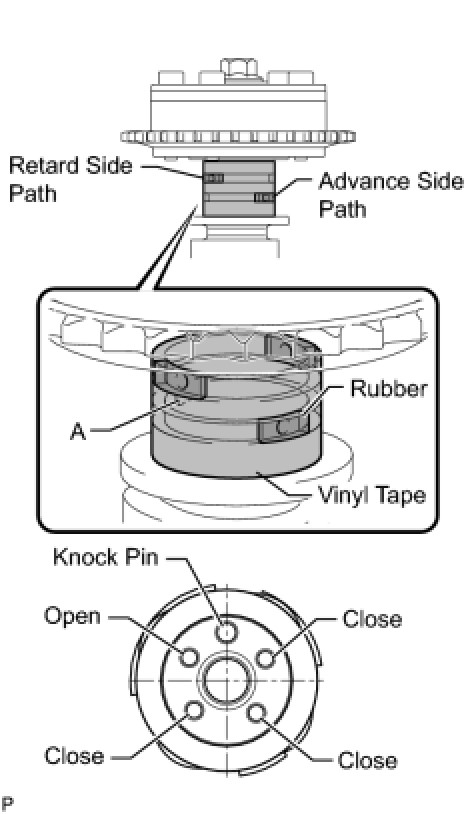 (4) While applying approximately 200 kPa (2.0 kgf/ cm2, 29 psi) of air pressure to the oil path, forcibly turn the camshaft timing gear assembly in the advance direction (counterclockwise).
