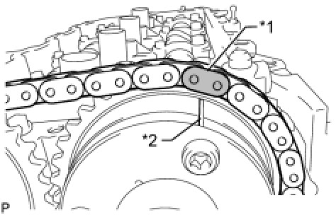 (c) Align the mark plate (pink or gold) of the chain with the timing mark of the crankshaft timing sprocket and install the chain to the crankshaft timing sprocket.
