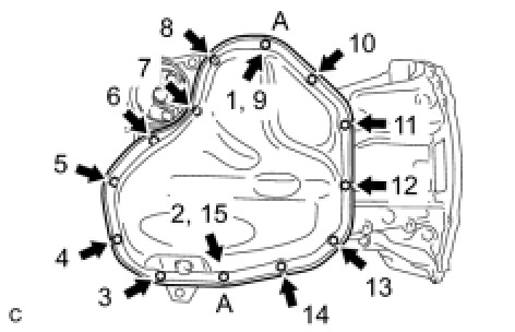 (b) Install the oil pan with the 11 bolts and 2 nuts in several steps, in the sequence shown in the illustration.