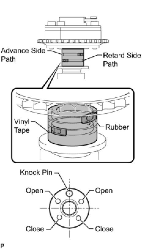 (6) When the camshaft timing exhaust gear moves to the most retarded position, release the air pressure from the advance side path, and then release the air pressure from the retard side path.